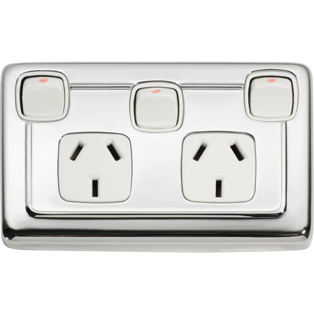 • TradCo Socket Flat Plate Rocker Double With Switch White Chrome Plated
