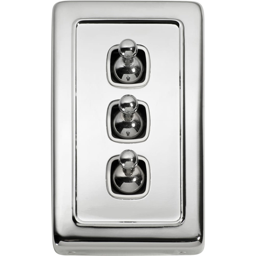 Switch Flat Plate Toggle 3 Gang White Chrome Plated