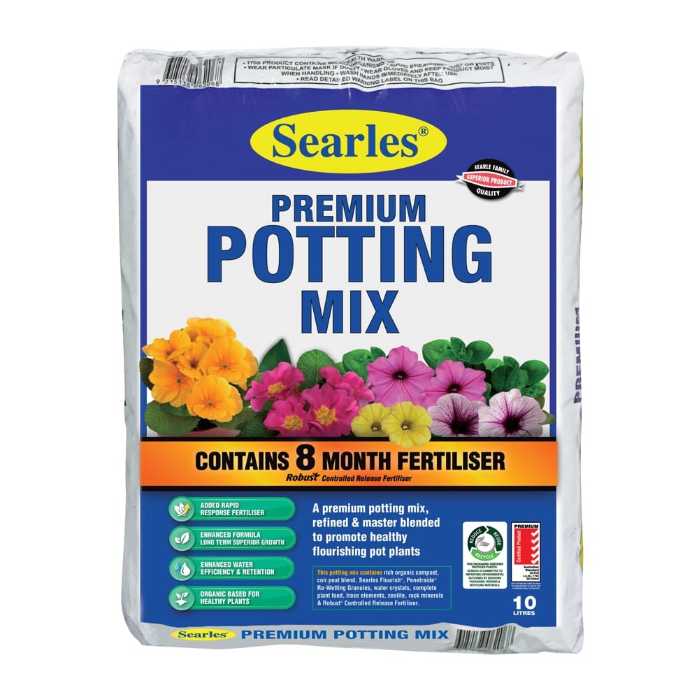 • Searles Premium Potting Mix is a high-quality potting mix containing a refined blend of selected high-quality ingredients. Also contained in this mixture is a specific amount of real organic compost and humus, which acts as a storehouse of nutrients, having the ability to store nutrients on colloid surfaces, protected from leaching while still being available to the plant when the plant requires more.